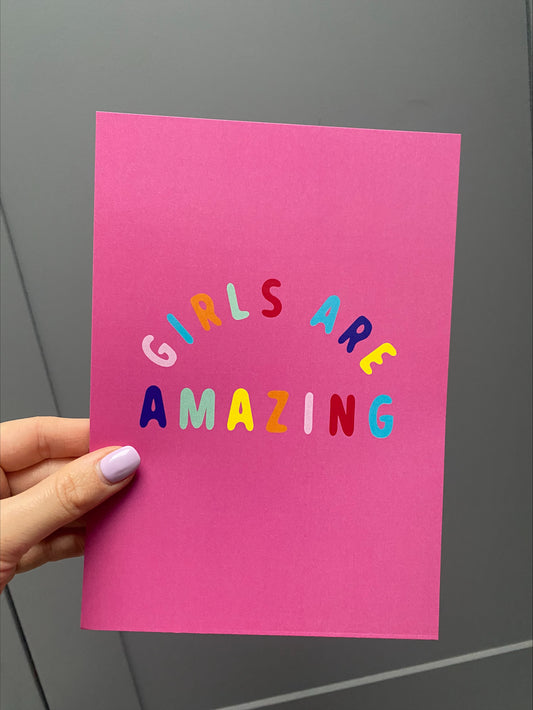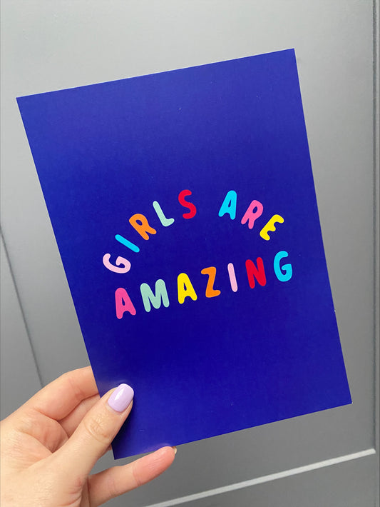 Girls Are Amazing Greeting Card – Positive Message Card for Kids with Blue Design